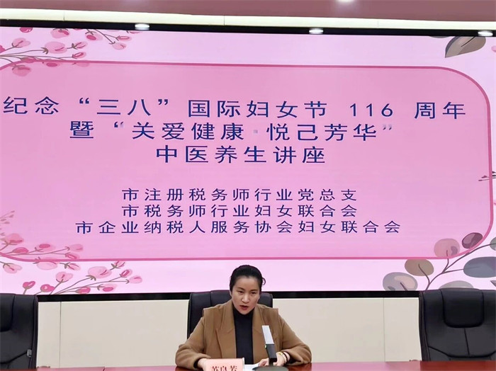 阳春三月,春意盎然。为庆祝第116个“三八”国际妇女节,切实关爱女职工身心健康,帮助职场女性缓解工作压力、掌握科学养生方法,3月6日,宜昌市注册税务师行业党总支联合市税务师行业妇女联合会、市企业纳税人服务协会妇女联合会,在宜昌市税务局四楼会议室共同开展 “关爱健康・悦己芳华” 中医养生专题讲座。宜昌市税务师行业妇联、市企业纳税人服务协会妇联主席苏良芳出席活动并致辞,市税务局纳税服务科四级主办安倩倩应邀出席,60余名女职工代表齐聚一堂,共赴这场健康之约。