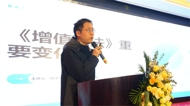 会议伊始,知名财税专家、中南财经政法大学候卓教授带来了关于增值税法的专业讲座。作为湖北省人大常委会立法顾问,候教授以其深厚的学术背景和丰富的实践经验,深入浅出地解读了增值税法的要点及其对企业的影响,并通过实际案例为听众提供了宝贵的实操建议。这不仅增强了参会者的法律意识,也为企业的财务税务规划指明了方向。