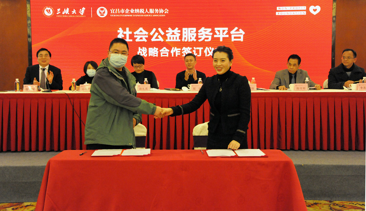 为了更好的为会员企业提供人才支持、智力支持、培训支持,协会充分依托高校人才优势,与三峡大学开展深度合作,遵循“资源共享、优势互补、共同发展、互利双赢”的宗旨,以公益慈善、人才培养、科技创新、成果转化、社会服务等为重点,以公益项目和慈善活动等为载体,以政产学研合作为纽带,发挥各自优势,通过多种形式开展合作,实现专业、产业、行业、企业相互促进,共同发展。在全体会员的见证下,协会会长贾文琼与三峡大学社会服务办副主任向雷举行了战略合作签约仪式。