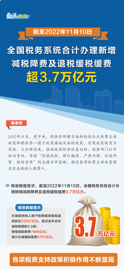 助企纾困稳发展!全国税务系统合计办理新增减税降费及退税缓税缓费超3.7万亿元